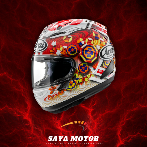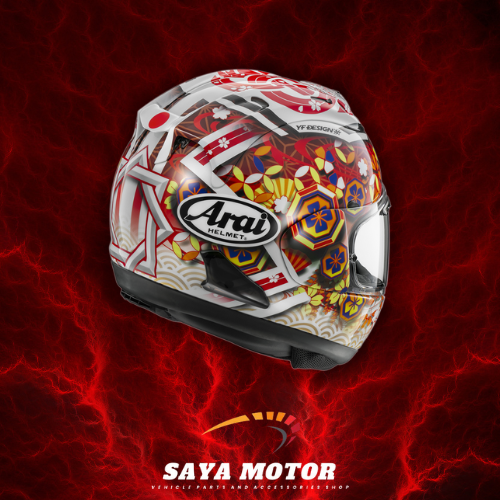 The Arai RX-7X Nakagami GP3 helmet is a full-face motorcycle helmet designed by Arai, known for its advanced safety features and performance. This specific model is a replica of the helmet used by Takaaki Nakagami, a Japanese MotoGP rider, and features a unique design with Japanese elements like the Hinomaru and an octagonal clover pattern.
